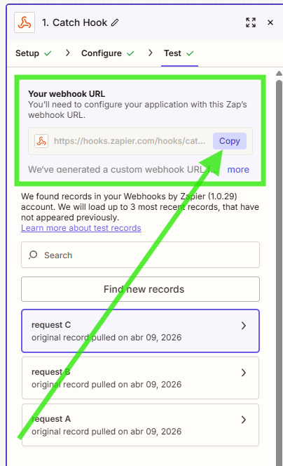 4. Zapier te generará una URL única que se ve así: https://hooks.zapier.com/hooks/catch/XXXXXXX/XXXXXXX/