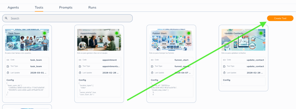 Una vez guardada la herramienta, ve a la configuración de tu agente y agrégala a la lista de herramientas disponibles. El agente va a leer su prompt junto con el prompt del sistema y va a saber exactamente en qué momento del flujo de conversación debe ejecutarla.