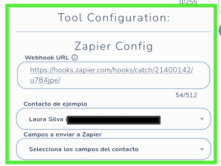 Contacto de ejemplo Selecciona un contacto de tu proyecto que tenga todos los campos completos. Este contacto se usa para hacer una prueba real del webhook antes de guardar la herramienta — si los datos no llegan correctamente a Zapier, Minds2.ai te va a avisar antes de guardar nada.