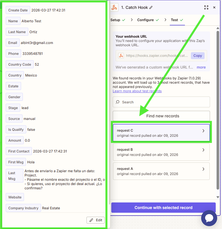 Cuando guardas la herramienta, Minds2.ai dispara automáticamente el webhook con los datos del contacto de ejemplo. En este momento, regresa a Zapier y haz clic en “Find new records”. Deberías ver un nuevo registro con todos los campos del contacto.