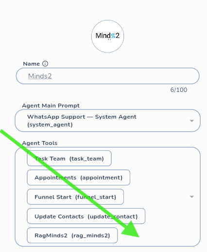 Cuando creas la herramienta Zapier, también defines un prompt que le dice al agente exactamente cuándo debe usarla. Minds2.ai incluye un prompt base que puedes usar tal cual o adaptar:
