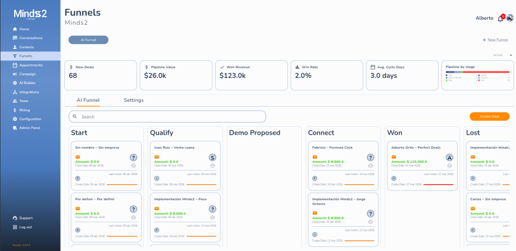 La herramienta Funnel Manager en Minds2.ai no le pide al vendedor que actualice nada. El agente lo hace solo, en tiempo real, mientras la conversación ocurre en WhatsApp.