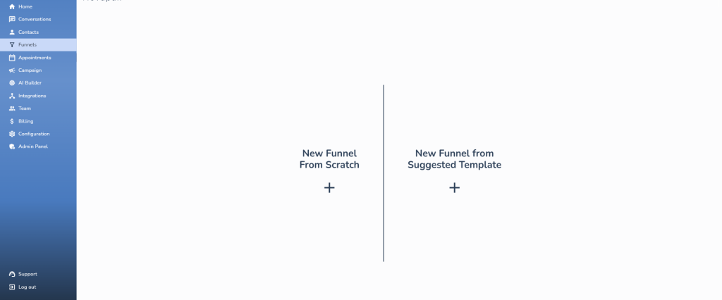 Ve a la sección de Funnels en el menú lateral. Si es la primera vez, verás dos opciones: crear uno desde cero o partir de una plantilla sugerida.