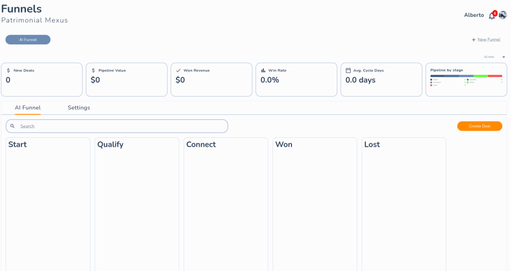 Una vez creado el funnel, verás tu pipeline con columnas vacías para cada etapa y los KPIs en cero, esperando datos reales.