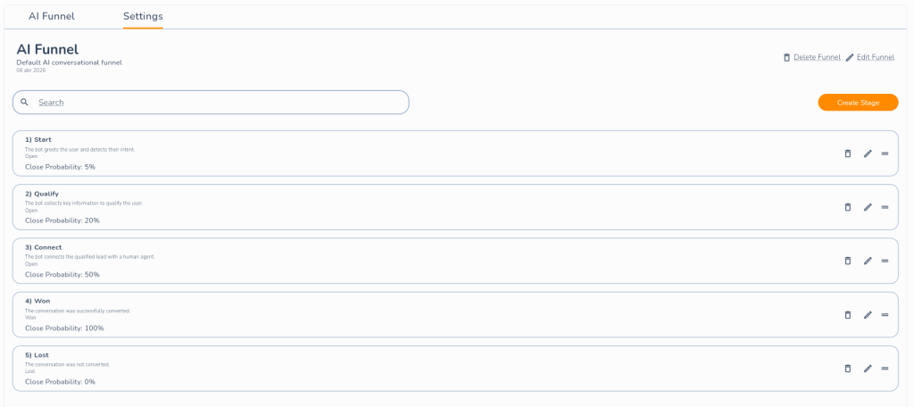 El agente combina el prompt de la herramienta con las descripciones de cada etapa del funnel y sabe exactamente qué hacer en cada momento de la conversación. Desde ese instante, cada conversación de WhatsApp alimenta tu pipeline automáticamente — en tiempo real, sin intervención humana.
