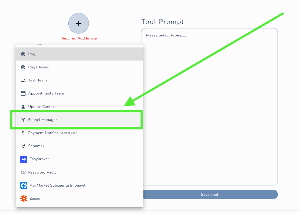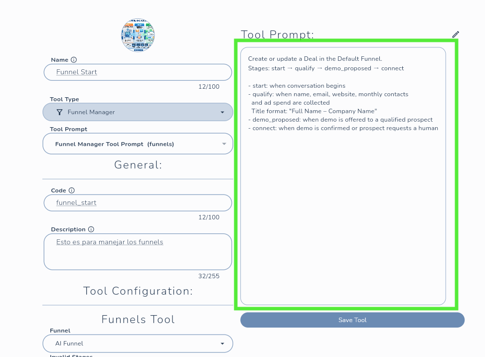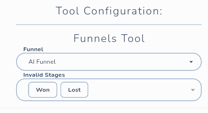 Ve a AI Builder → Tools y crea una nueva herramienta de tipo Funnel Manager.