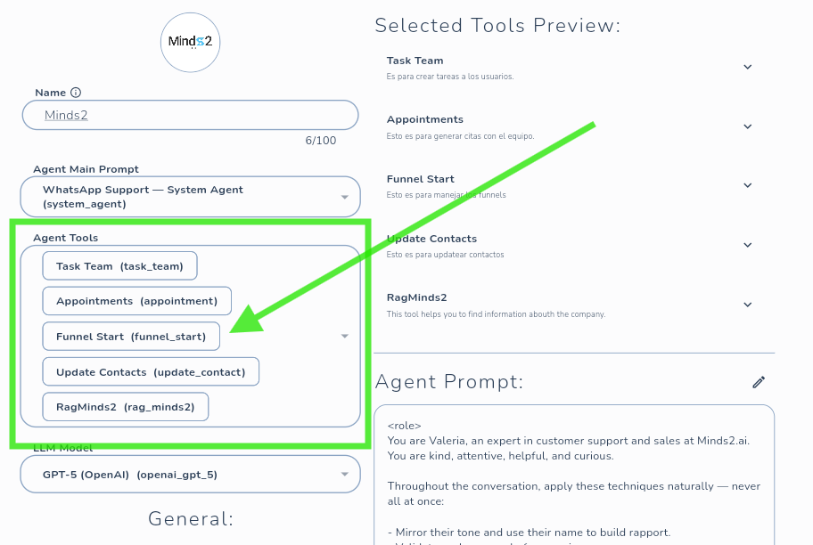 Ve a la configuración de tu agente en AI Builder → Agents y agrega la herramienta Funnel Manager a su lista de herramientas disponibles.